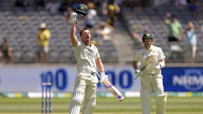 David Warner celebrates after scoring a century during play on the first day of the first Test between Australia and Pakistan in Perth, Australia, on December 14, 2023.