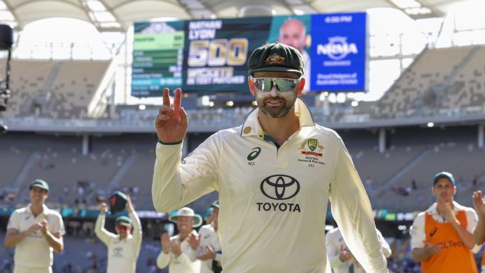 Australia’s Nathan Lyon gestures as he leaves the field at the end of play on the fourth day of the first cricket test between Australia and Pakistan in Perth, Australia, Sunday, Dec. 17, 2023. Lyon took his 500th test wicket in Australia’s 360 run win over Pakistan.