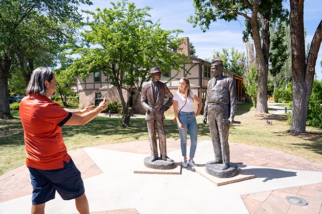 Visitors seize the chance to take a photo with Oppie and Groves near Fuller Lodge. Courtesy/LAC
