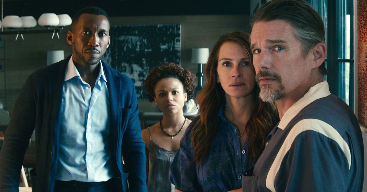 Sam Esmail’s Leave the World Behind takes the characters and incidents of Alam’s novel and situates them inside a more pronounced, though not particularly convincing, apocalyptic thriller. Amanda (Julia Roberts) and Clay (Ethan Hawke) are a well-to-do Brooklyn couple who’ve rented a vacation house in a rural enclave outside of New York City with their two teenage kids. Not long after they arrive, however, certain unnerving incidents begin to occur, most notably a massive tanker running aground on a crowded beach. One night, a man in a black tie, George (Mahershala Ali), and his daughter, Ruth (Myha’la Herrold), arrive and ask to be let in. They are, it turns out, the owners of the property and have driven all the way out here after the city was plunged into a blackout. The casual, go-along-to-get-along Clay is happy to let them in, but the anxious, vaguely Karen-y Amanda is immediately suspicious of the two African Americans.