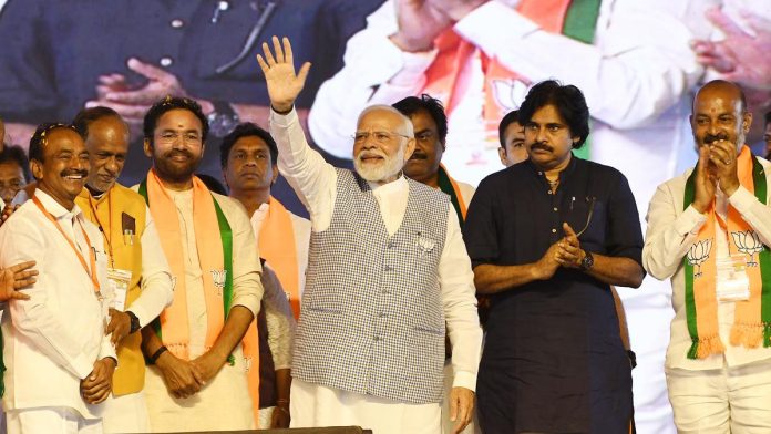 Prime Minister Narendra Modi along with Janasena Party president Pawan Kalyan, Union Minister and BJP State president G. Kishan Reddy, MP Bandi Sanjay Kumar and chairman of election management committee of Telangana BJP Eatala Rajender and others at ‘BC Atma Gaurav Sabha’ in Hyderabad on Tuesday.