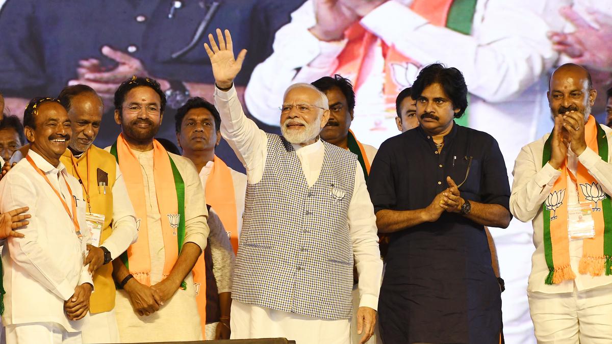 Earlier, Mr. Modi came by road to the venue after landing at the Begumpet airport. He came into the stadium in an open vehicle with Union Minister G. Kishan Reddy, national general secretary Bandi Sanjay Kumar and party election campaign committee chairman Eatala Rajender with A.R. Rahman’s ‘Vande Mataram’ song being played on the speakers and flower petals being showered amid ‘Modi…Modi” slogans.