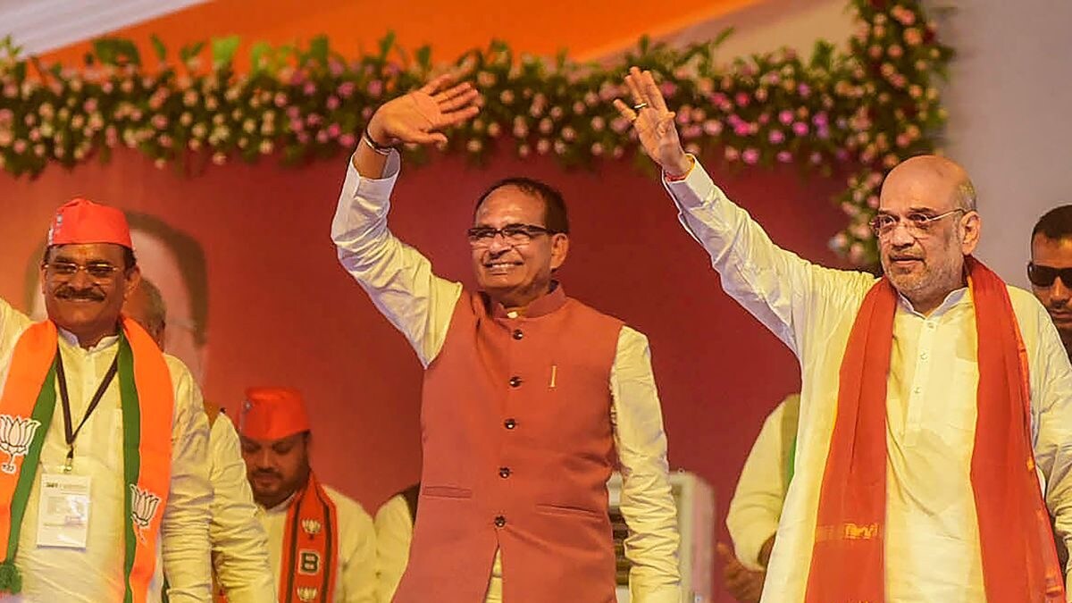 Union Home Minister Amit Shah with Madhya Pradesh CM Shivraj Singh Chouhan and VD Sharma in Indore. (Credits: PTI)